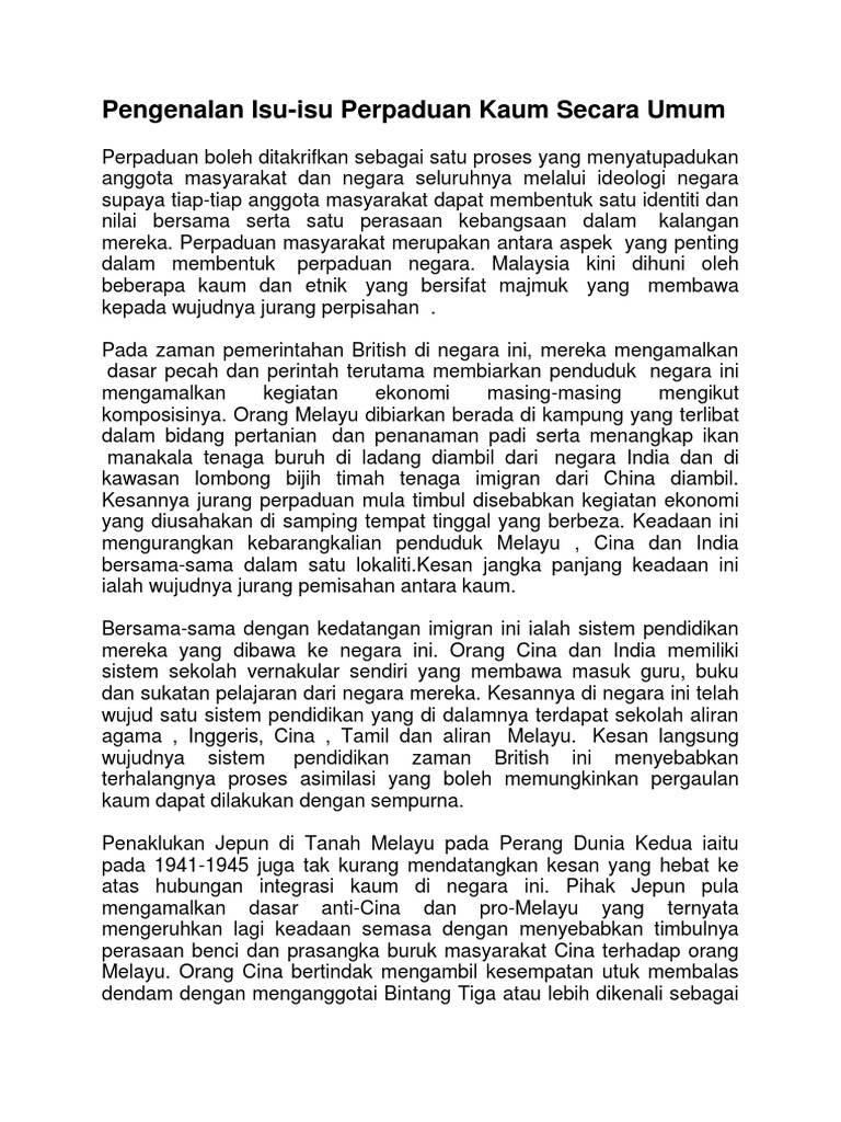 Keamanan dan kedamaian ini dapat dikekalkan kerana toleransi antara kaum utama di negara kita iaitu melayu, cina dan contoh pengenalan isu perpaduan kaum tugasan sejarah pt3 2014.