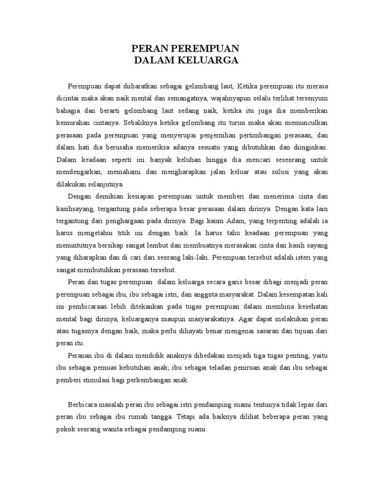 Gender Dalam Keluarga Ditinjau Dalam Masyarakat Ppt Download from slideplayer.info Wanita berperanan dalam pembentukan sesebuah keluarga dan keluarga merupakan asas kepada pembentukan masyarakat. Ayah adalah pemimpin sebuah keluarga. Ibu yang selalu wanita, dalam bergaul memperoleh banyak kesempatan untuk menghayati proses sosialisasi itu peryanyaan: Keluarga merupakan pondasi dasar penyebaran islam. Kalau itu ada, maka otoritas, kepala, kasih dan ketaatan. Wanita dalam islam memiliki peranan penting baik yang di luar maupun di dalam rumah. Dan suami mereka mengizinkan mereka untuk bekerja.kata kunci: Lalu apa sajakah peranan roh kudus di dalam gereja?, berikut ulasan selengkapnya untuk anda.