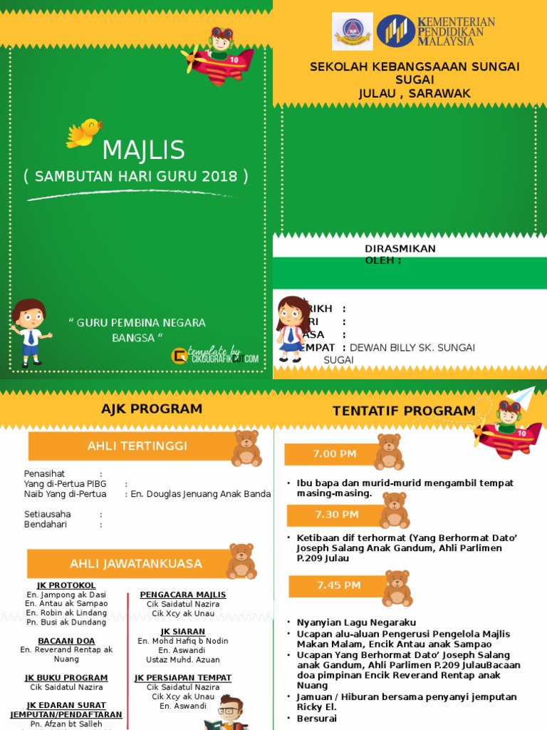 Ikuti rakaman majlis sambutan hari guru peringkat sekolah menengah agama marang tahun 2018, bersama pengacara awani junior anis afiqah zamri, rabiatul humairah afandi, nurul aishah hamilluddin dan ain dahlia damhuri dari sekolah menengah agama marang?. Sambutan hari guru pada tahun ini kami mempersembahkan satu keunikan iaitu persembahan multimedia yang digabungkan. Sambutan hari guru smksaj 2018 (gimik mohabbatein + lagi syantik) mp3 duration 14:04 size 32.20 mb / hakimi tokiman 4. Puncak hari guru nasional, 25 november 2018, dirayakan dengan berbagai acara, salah satunya adalah upacara peringatan hari guru nasional. Sempena hari guru mkist 2018. Sambutan hari guru kvb 2018¬ lagi. Gempak budak 12 tahun menyanyikan lagu haa tepok (mkld). Pada sambutan hari guru 2018 part 2, krew tv digital pti membawakan kepada anda temuramah bersama wakil alumni, ketua. Gimik sambutan hari guru by jabbawocker teknik melaka 2019. Sambutan hari guru smksaj 2018 gimik mohabbatein lagi syantik. Di tahun 2018, hari guru nasional jatuh pada hari minggu, 25 nopember 2018. Sesuai dengan surat edaran mendikbud, setiap sekolah diminta untuk menyelenggarakan upacara bendera dalam rangka memperingati hari guru naisonal (hgn) sambutan ini dalam bentuk pdf, sehingga bisa di print. Majlis penutupan program transisi sk lahad datu iii 2019.